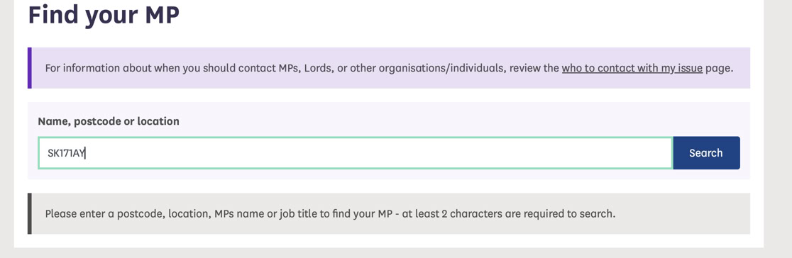 To find your MP Use the LINK - This will open a new page where you will see Box 1